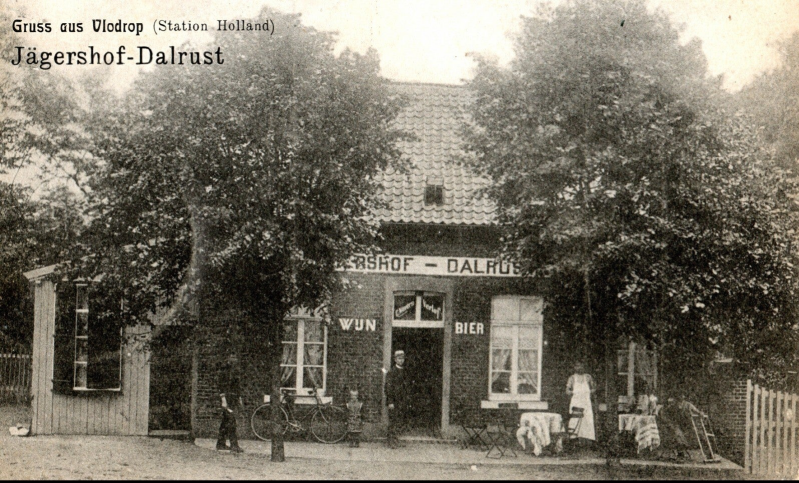 Tien jaar later was het nog steeds een geliefde plek. De foto boven deze aflevering is een ansichtkaart van Dalrust uit 1908 met de tekst ‘Gruss aus Vlodrop (Station-Holland)’. Het café ziet er vriendelijk uit met een kastelein met een lange witte schort, een gast met een strohoed, een meisje van een jaar of zes en een bosarbeider met zijn spanzaag. Dalrust lag op de plek waar nu het voormalige café Van Kempen staat.
